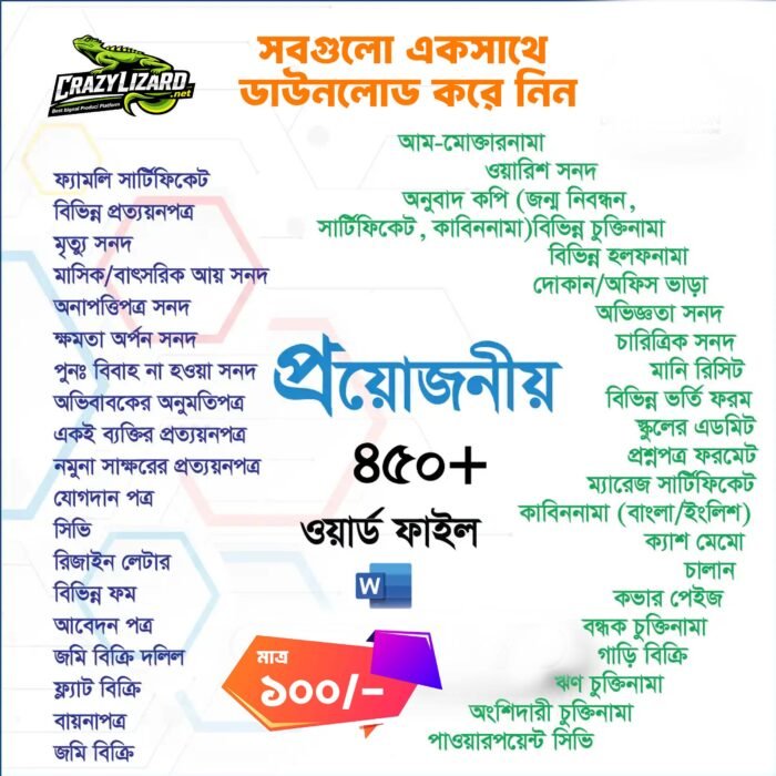 450+ Word File Collection এর ভিতর মাইক্রোসফট ওয়ার্ড এর সব ধরণের ফাইল কালেকশন পাবেন। প্রত্যয়ন পত্র, আবেদন পত্র, জমি বিক্রির দলিল, সনদ পত্র, হলফনামা এবং রিজাইন লেটার সহ বিভিন্ন ধরণের এডিটেবল ওয়ার্ড ফাইল রয়েছে এই ফাইলে।